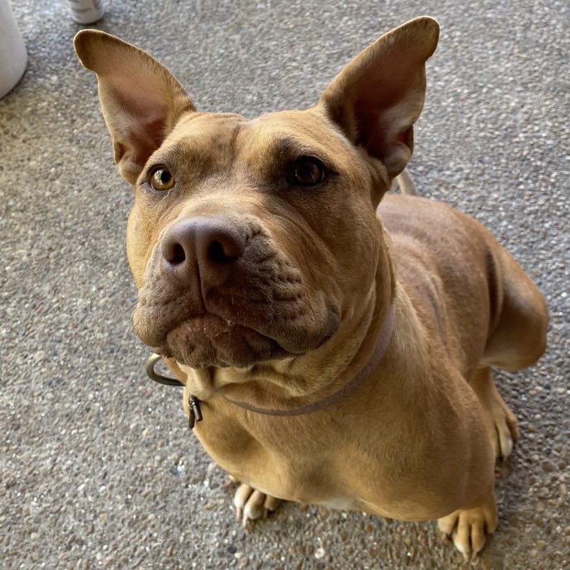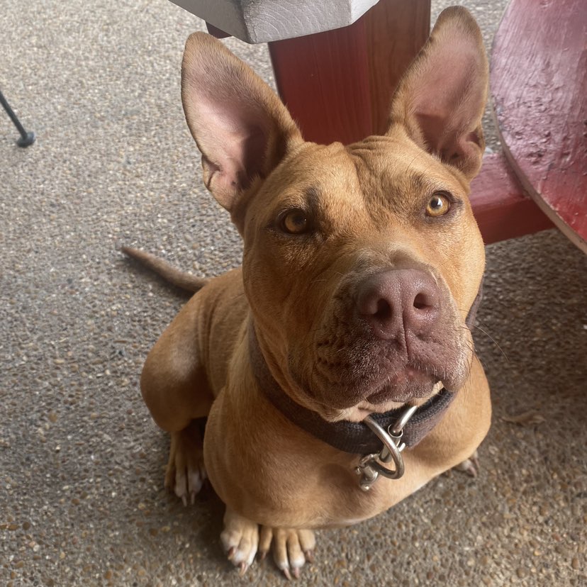 This is daisy. Sheโs a really loving dog but gets really jealous when you start sharing love with other dogs and well play fight with them. Sheโs a really vocal dog when it comes too playing. Iโm not really sure about her age but I know shes at least 2 or 3 Sheโs also not good with other small dogs/cats. She pulls on the leash when going out.